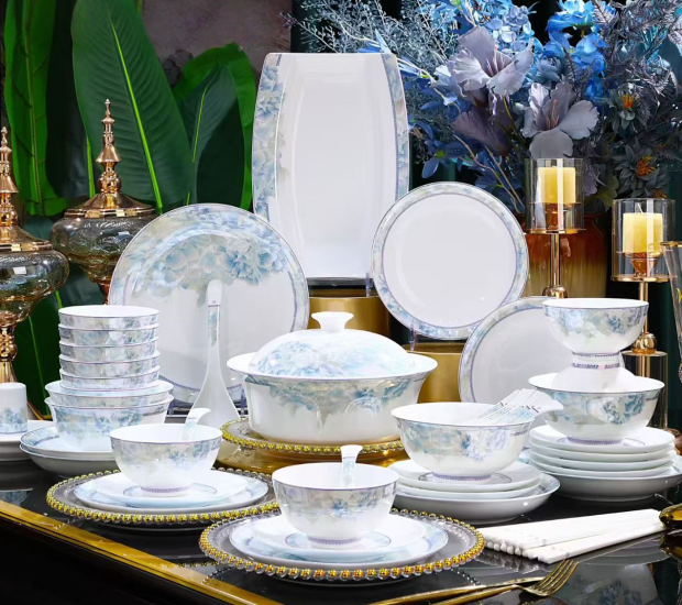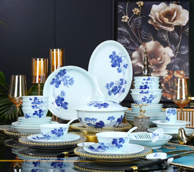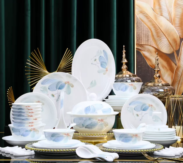 58-Piece Jingdezhen White Jade Porcelain Dinnerware Set, Elegant Blue Floral Pattern Luxury Tableware