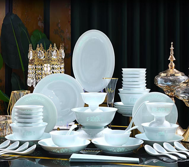 58-Piece Jingdezhen Celadon Linglong Porcelain Dinnerware Set, Handmade Intertwined Lotus Pattern