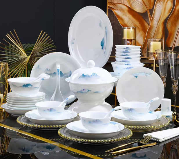 58-Piece Jingdezhen White Jade Porcelain Dinnerware Set, Hand-Painted Blue Mountain Landscape Luxury Tableware
