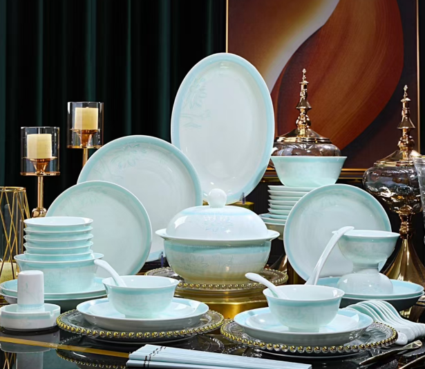 58-Piece Jingdezhen Celadon Jade Clay Dinnerware Set, Handmade Water Lily Lotus Pattern Luxury Tableware