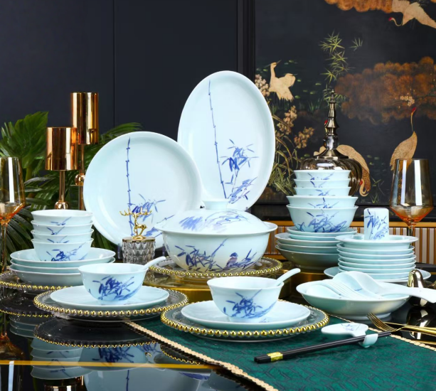68-Piece Jingdezhen Hand-Painted Blue Bamboo Celadon Porcelain Dinnerware Set, Luxury Artisan Tableware